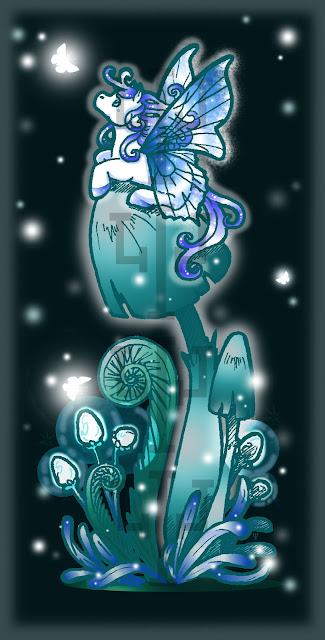 " In the wake of "winged horses and unicorns", here you find another little one who is relaxing on a mushroom, watching moths and fireflies dancing in the dark.