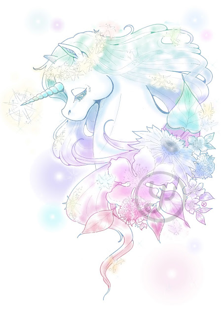 "I wanted to create an elegant illustration with a Unicorn (in my own personal style) so I started by drawing the mystical creature and then, on another sheet, I did the flowers.